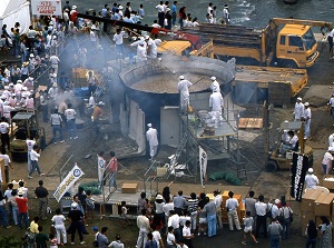 Of course, the pots are too large, so a few backhoes (mobile cranes) are also operated to cook.