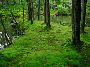 There is a pond named Ougonchi (黄金池) in the site, and the whole grounds around the pond are covered with mosses completely.