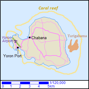 There is Yoron Airport and Yoron Port at the west edge of the island.